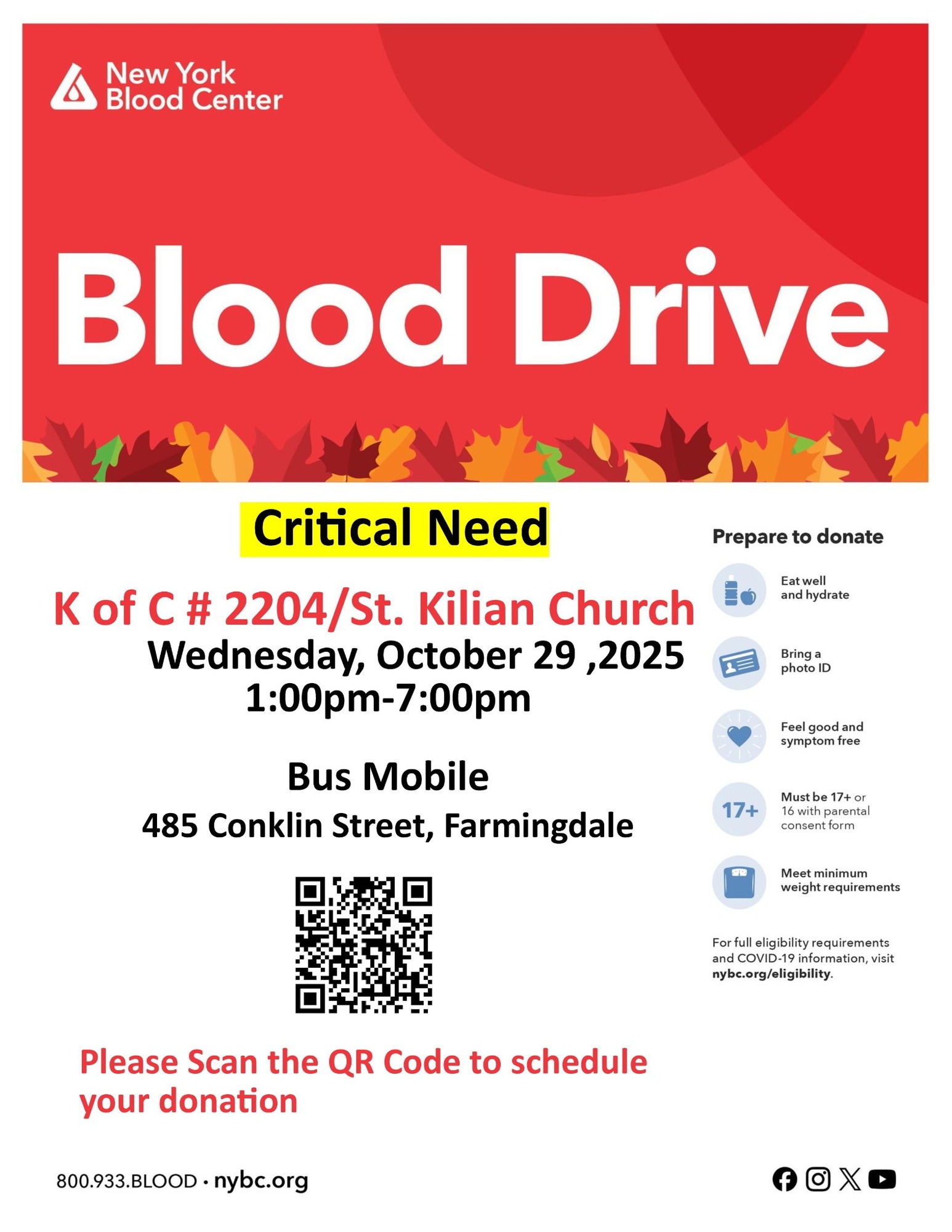 Blood Drive Sponsored by the St. Kilian's Knights of Columbus